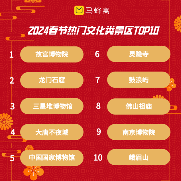 打卡博物馆、石窟、寺庙等历史文化场所,是继庙会灯会、民俗活动之后今年春节出游另一大亮点。博物馆几乎成为游客赴一地的必游景点,故宫博物院、三星堆博物馆、中国国家博物馆、南京博物院在马蜂窝春节热门文化类景区前十中占据四席。比起走马观花,在专业讲解带领下的深度游正为越来越多游客所青睐,马蜂窝博物馆讲解类产品是本地游最受欢迎的产品之一。