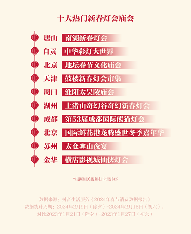 各地推出的灯会庙会等民俗文化活动吸引网友打卡。唐山南湖新春灯会、自贡中华彩灯大世界、北京地坛春节文化庙会为抖音网友最热衷打卡的三大新春灯会庙会。此外,成都的国际熊猫灯会、融合传统仙侠文化和影视IP的横店仙侠灯会等独具地方特色的灯会,也受到人们追捧。