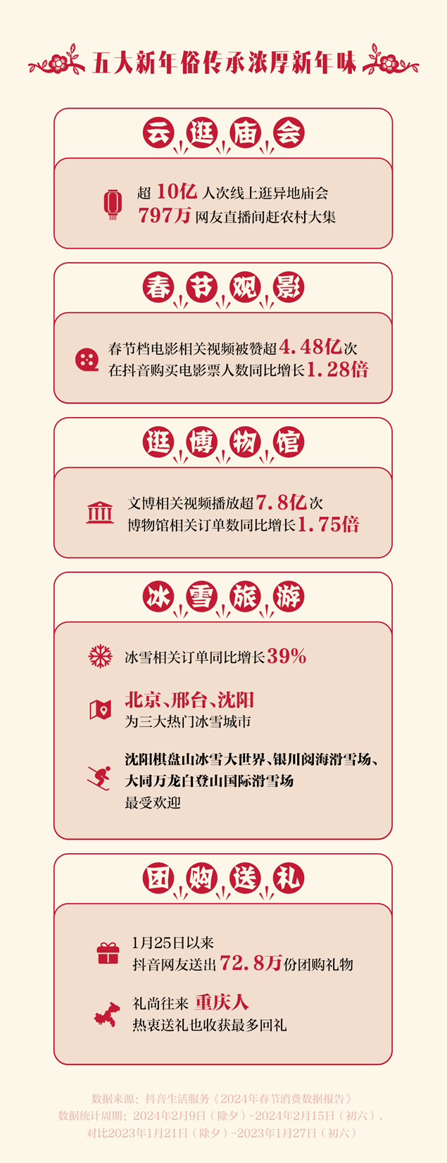 春节假期,超10亿人次线上逛异地庙会,在抖音购买电影票人数同比增长1.28倍,博物馆相关订单数同比增长1.75倍……云逛庙会、春节观影、逛博物馆、冰雪旅游、团购送礼等成为人们过年新习俗。