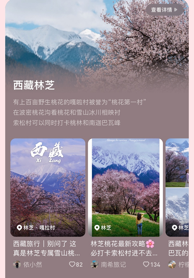为满足年轻人日益个性化的赏花需求,2024年的赏花地图除了按照地区和花卉品种分类呈现攻略信息,精选优质达人笔记外,还将该地区围绕“赏花”延伸而出的全新玩法和特色体验罗列其中。去林芝赏桃花之余来一次冰川徒步,去川西赏梨花的同时深入藏区体验地道藏式生活,在贵安万亩樱花园中拍出自己的“人生照片”,每个人都可以根据自己的兴趣偏好,在当地找到最适合自己的赏花“姿势”。