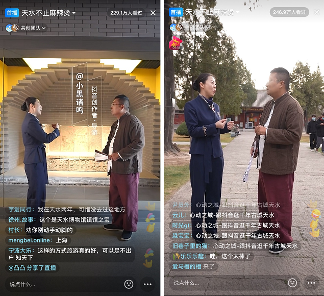 3月27日19点,抖音生活服务邀请文旅达人@小黑诸鸣 开启“心动之城-天水不止麻辣烫”直播。直播间里,@小黑诸鸣 带领大家先后“云游”天水博物馆、麦积山风景名胜区。直播在@抖音集团、@抖音和ta的朋友们、@抖音生活服务 等官方抖音号同步播出,共计500多万人次观看。