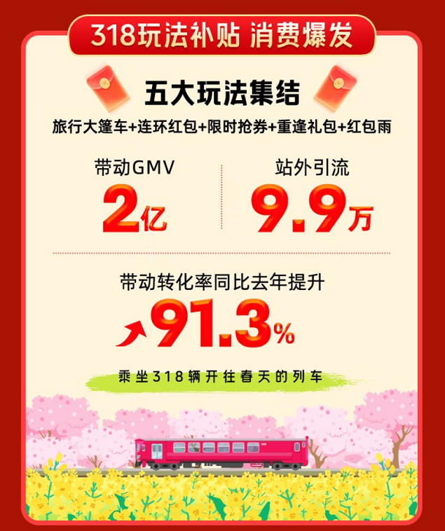 从2023年开始,携程通过覆盖全峰全谷的营销活动联合旅业合作伙伴,打造错峰旅游和错峰营销的热潮。携程318是2024年其发起的首个大型淡季营销活动,参与商家近800万,同比去年增长127%,参与活动的城市超过323个,通过活动实现超百万GMV的商家同比增长49%,且整体转化率提升了91.3%。