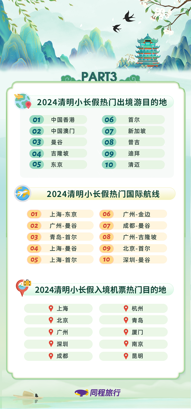 入境游方面,同程旅行数据显示,入境机票最热门的目的地为上海、北京、广州。除北上广外,成都、杭州、青岛、厦门、昆明等城市的入境机票也较热门。对中国不熟悉的外国游客主要选择国际航班较多、知名度较高的城市作为入境游的“第一落点”,开启他们的中国之行。来自中国香港和中国澳门的居民则更多选择从广州、深圳、珠海口岸来到内地旅行,同程旅行数据显示,清明前夕港澳居民对广州、深圳、珠海的旅游信息关注度显著增长,相关搜索量同比增长78%。