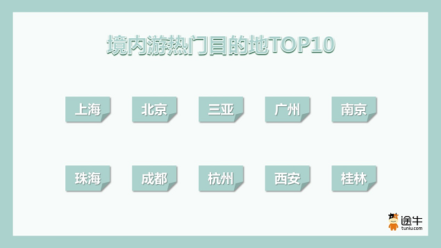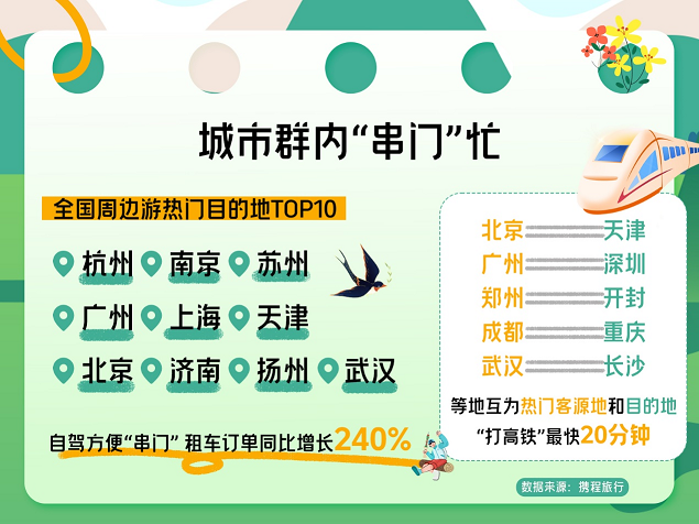 短途游成为许多人的假期首选。携程发现,上海、北京、成都、杭州、广州等地的旅客假期期间最爱到周边旅游,全国周边游热门目的地Top10包括:杭州、南京、苏州、广州、上海、天津、北京、济南、扬州、武汉。