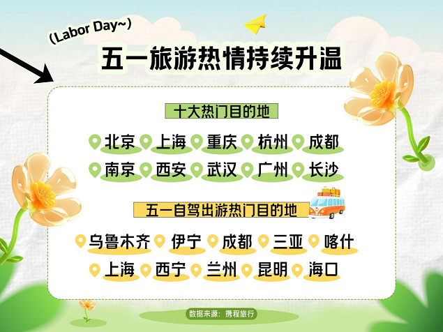越来越多人开始加入自驾行列,欣赏沿途风景。五一期间,携程租车国内租车自驾订单同比增长40%,其中新客占比42%,海外租车自驾订单同比增长132%,新客占比60%。乌鲁木齐、伊宁、成都、三亚、喀什、上海、西宁、兰州、昆明、海口为五一自驾出游热门目的地。烟台、大同、太原、宁波、呼伦贝尔等地是租车订单同比增长较快的黑马目的地。西北、西南、海南等重点自驾路线受到游客欢迎,武夷山国家公园1号风景道五一假期正式运营,带动福建、江西周边城市租车自驾订单同比增长60%。