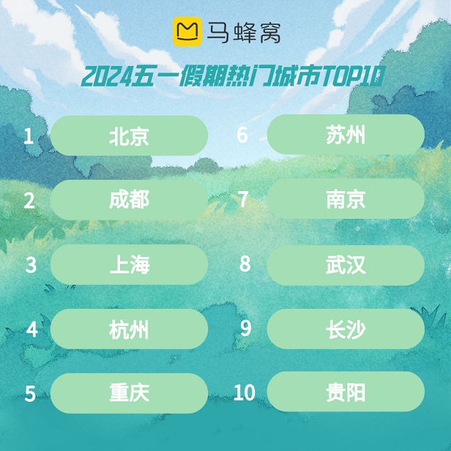 同样带动目的地旅游“起飞”的还有演唱会和音乐节。五一期间,为了青春和热爱奔赴远方成为了不少年轻人的出行动力。除了名胜古迹,“超级草莓音乐节”和“凤凰传奇演唱会”对北京的登顶同样功不可没。众星云集的天津“泡泡岛音乐节”帮助天津热度高涨266%,贵阳的“路边音乐会”更是把乐迷们的快乐玩成了人人皆可参与的全民狂欢,实力将贵阳送入热门目的地前十。