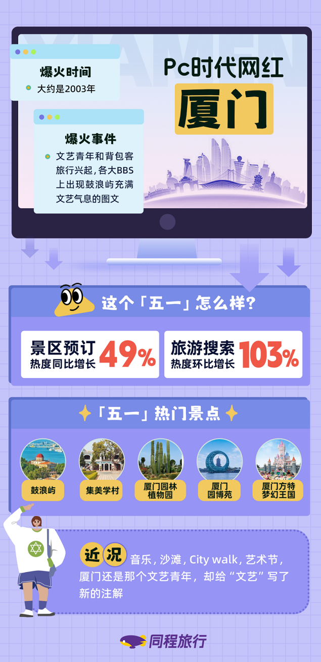 自2003年文艺青年和背包客旅行兴起以来,厦门鼓浪屿的文艺气息就吸引了无数游客。同程旅行数据显示,今年“五一”小长假,厦门景区预订热度同比增长49%,旅游搜索热度环比上涨103%。鼓浪屿、集美学村等热门景点依旧人头攒动,厦门不仅是文艺青年的向往,更通过音乐、沙滩和艺术节等多元化活动,丰富了城市的旅游体验。