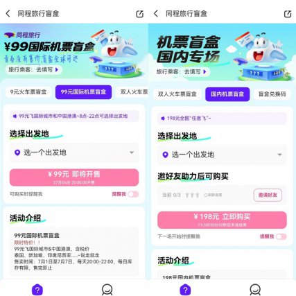 目前同程旅行平台上线的暑期机票盲盒,198元(含机建燃油)全国任意飞,最低99元(含税)飞泰国、新加坡、印度尼西亚及中国港澳等,也为暑期出游提供了更具性价比的优惠。同程旅行“717一起旅行节”还有免费国内国际机票,特价航线、国内国际机票优惠券等暑期出行福利推出。