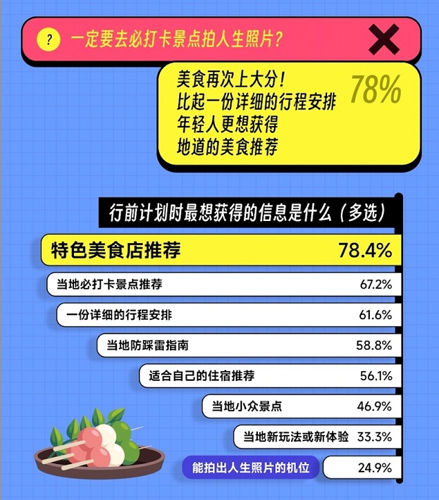 别的方面精打细算的年轻人,在“吃”这件事上一点儿也不含糊,66.1%的年轻人愿意为“美食”留出最多预算。“淄博烧烤“和”天水麻辣烫“等实例完美印证了这一结论。特色美食对年轻人的吸引力与日俱增,“一样美食带火一座城”几乎成为近两年小众目的地出圈的流量密码。