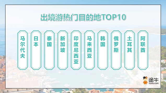 出境游热门目的地中,马尔代夫、日本、泰国、新加坡、印度尼西亚、马来西亚、韩国、俄罗斯、土耳其、阿联酋是途牛用户的热门选择。尽管暑期并非马尔代夫、巴厘岛、普吉岛等海岛游目的地的传统旅游旺季,但在游客的出游热情推动下,相关目的地的出游热度依然持续走高。