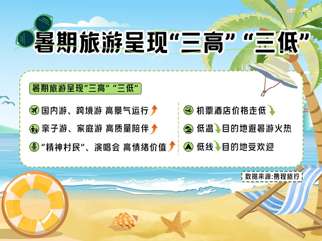 伴随中小学陆续开学,为期2个月的暑期旅游市场告一段落。8月28日,携程发布《2024暑期出游市场报告》(以下简称“报告”)。报告显示,今年暑假旅游市场继续展现消费韧性,整体呈现“三高三低”特征。“三高”即国内游、跨境游持续保持高景气运行,高质量陪伴的亲子游、家庭游持续火热,“精神村民”、City ride、演唱会等提供高情绪价值的玩法受到年轻人追捧;“三低”即适宜避暑的低温目的地及室内项目火爆,机票酒店因供应恢复呈现价格走低趋势,三四线城市、县域及乡村等低线目的地一路走红。