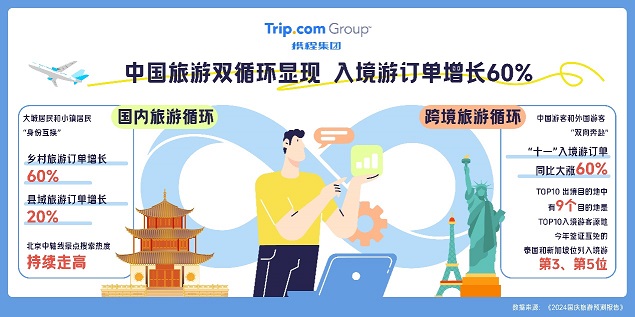 旅游行业正呈现双循环特征。国内循环方面,大城青年和小镇青年“身份互换”,一二线城市旅客来到县城休闲游和回乡省亲,带动乡村游订单增长超60%,县域游订单同比增长20%。县城大部分旅客来自一二线城市,异地旅客更是占比更高。北京中轴线申遗成功后,带动鼓楼、景山等中轴线景点搜索热度持续走高,吸引全国各地“小镇青年”和“小镇中年”来体验中轴线的魅力。