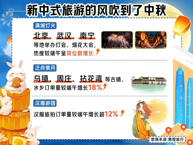 古镇水乡也展现了传统节日的特色。乌镇重现“走月亮”习俗,游客可穿着汉服提灯走桥、月下畅游,周庄古镇推出灯彩主题游船,拈花湾推出戏剧生活节……上述景区中秋假期门票订单量较端午增长了18%。游客们或在古镇的街巷中游走,或在水乡的河道里泛舟赏月,何尝不是一种对中秋传统的回应。