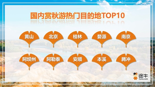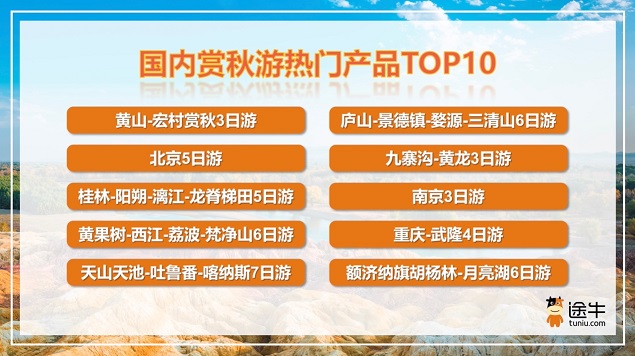 此外,九寨沟/黄龙、钟山风景名胜区、黄果树风景区、重庆武隆、新疆喀纳斯、额济纳旗胡杨林等景区景点相关的旅游产品也是途牛用户的热门之选。