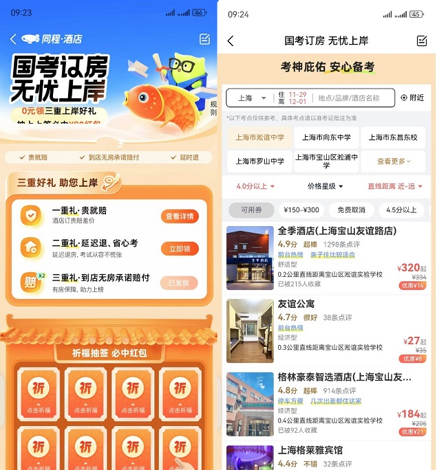 同程旅行向全国国考生推出酒店“随时退”、“贵就赔”等服务