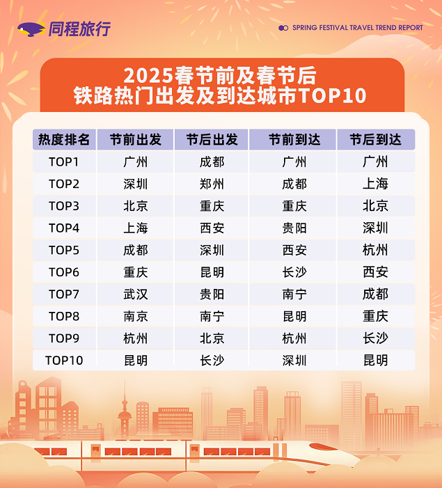 2025年春运期间铁路及民航客流在时空分布上仍然呈现出明显的“潮汐”特征,即节前客流主要是从一线城市及东部中心城市向中西部地区移动,节后则相反。《报告》显示,铁路节前热门出发城市主要以高校及务工人员相对集中的一线城市和中心城市为主,主要有广州、深圳、北京、上海、成都、重庆、武汉、南京、杭州、昆明。节后的热门出发城市则相对集中在成都、郑州、重庆、西安、深圳、昆明、贵阳、南宁、北京、长沙等,客流结构主要是返程的上班族和游客。