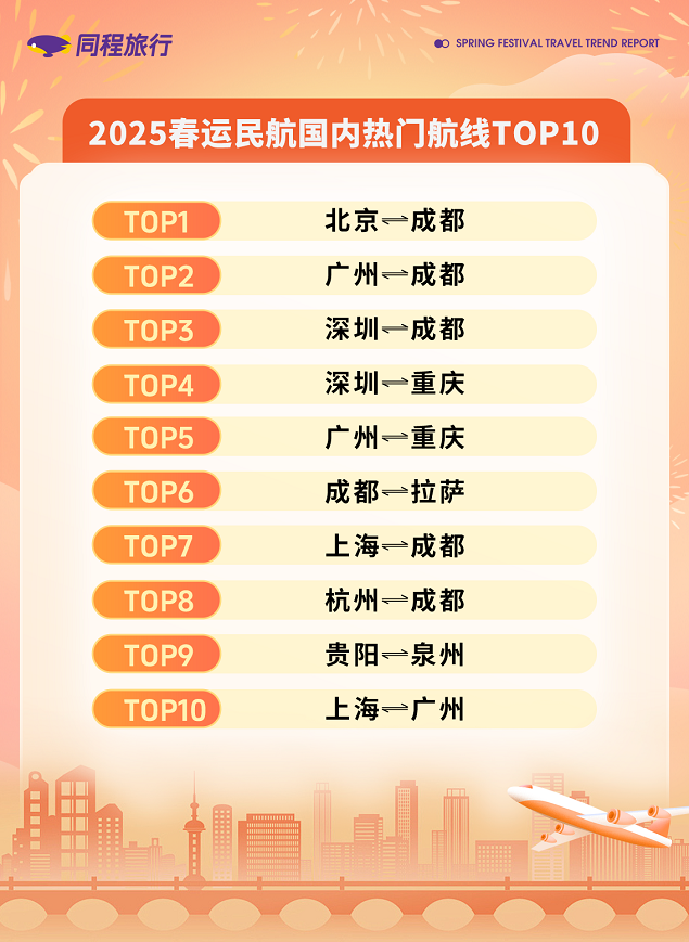 民航方面,春运期间,连接核心城市与热门目的地的航线以及探亲返乡航线客流量最大。《报告》来自同程旅行平台的春运机票预订数据显示,北京═成都、广州═成都、深圳═成都、深圳═重庆、广州═重庆、成都═拉萨、上海═成都、杭州═成都、贵阳═泉州、上海═广州等航线相对比较热门。