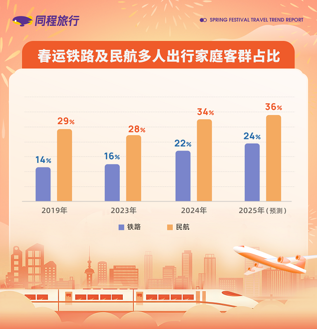 2025年春运举家出行的比例有明显上升。《报告》数据显示,2025年春运铁路多人同行的出行需求中家庭占比24%,民航的家庭出行占比更是高达36%,较去年有所上升。