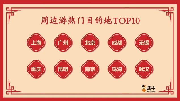 周边游方面,更多用户选择了自驾游的出游方式。其中,上海、广州、北京、成都、无锡、重庆、昆明、南京、珠海、武汉等目的地是周边游用户更为热门的选择。家门口的博物馆、古镇古街、主题乐园备受周边游用户青睐。