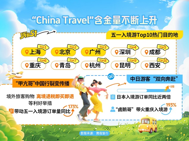 有趣的是,近日日本电视节目播出:日本人最想去的海外城市增长排名上海位列第一。紧跟韩国的步伐,五一入境游客源国日本排第二。据悉,4月底到5月初也是日本黄金周,五一日本游客入境游订单同比增长近两倍,五一假期中日游客实现了“双向奔赴”。网友笑称:“中日黄金周这是互抄作业?”此外,多次给SPEED甲亢哥投喂卤鹅和烤乳猪的“卤鹅哥”带火了重庆入境游,重庆五一入境游订单同比增长193%。