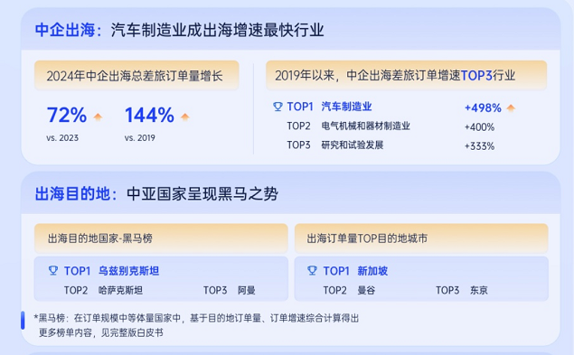 顺应全球产业链迁移趋势,跨国差旅需求量攀升。2024年中企出海差旅量同比增长72%,较2019年更是增长144%。与此同时,出海目的地范围持续拓展,2024年新增出海目的地城市超5000个,印尼等国家的城市成为热门新增城市。从细分行业来看,软件和信息技术行业出海热度最高,汽车制造业出海增速最为迅猛。