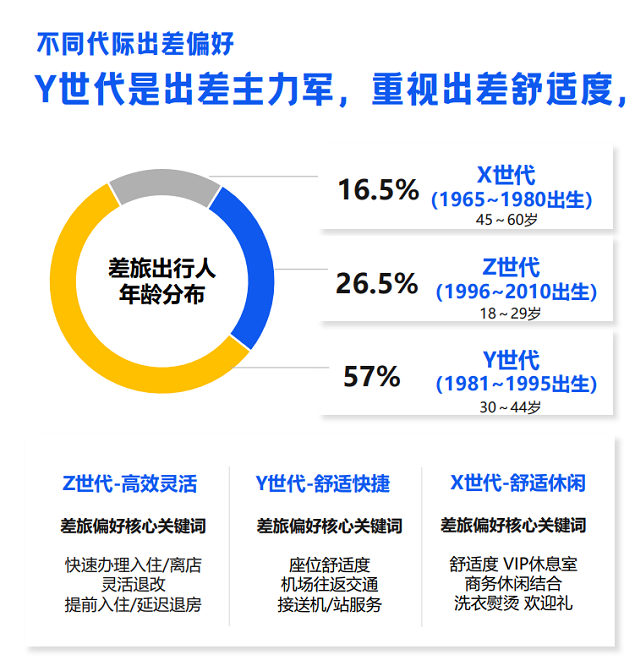 不同世代方面:X世代(1965~1980出生)偏好舒适及商务休闲相结合,偏爱飞机出行;Y世代(1981~1995出生)是出差主力军占比57%,更在意舒适与快捷;Z世代(1996~2010出生)偏爱火车/高铁出行,则更注重高效与灵活。