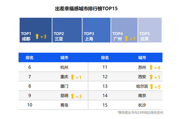 从差旅幸福感城市和适合商务休闲相结合的城市来看,成都获评最具差旅幸福感城市,“尔滨”新晋上榜,更受Z世代青睐。除此之外,三亚、上海、广州、青岛也位列前茅。