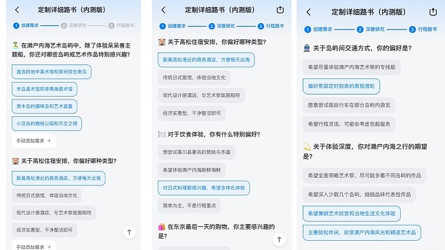 “提出精准需求是用户利用AI工具做出靠谱攻略的先决条件,而由于对目的地了解有限、自身需求不明确、缺少灵感等原因,很多用户并不能提出‘面面俱到’的需求,AI自然也无法生成用户心中的‘完美攻略’。”马蜂窝AI项目负责人说,“因此,我们把‘AI路书’定制攻略的第一步设计为主动提问,让用户在AI提问的引导下逐步理清思路,由AI重新整理需求交由用户确认无误后,再进入研究和定制流程。用户在AI提问环节除了做选择题,还可以手动添加选项,对AI整理完毕的需求也可以进行调整修改,整个过程专业、周全、富有人情味。”
