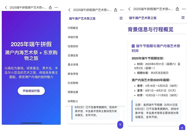 明确需求后,“AI路书”会针对整个旅行的所有环节进行深入研究分析,为用户量身定制一份包含行程、住宿、交通、景点、美食、购物、预算、以及实用贴士等高度个性化的整体方案,还可点击目录跳转,快速查看相应环节信息。目前该功能已开放测试,每日限量发放内测码,用户可在马蜂窝APP首页点击“AI路书”进行申请。