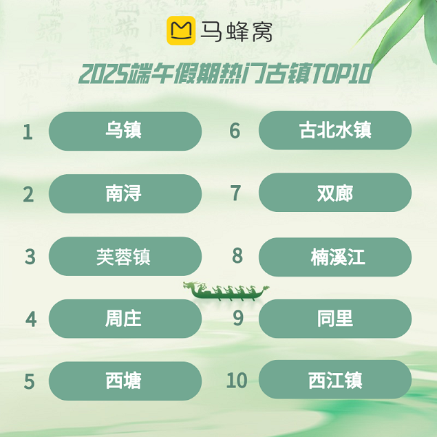城市周边人文气息浓厚的古镇同样是沉浸式体验非遗民俗的好去处。住进古镇中的民宿,体验亲手包粽子、做香囊、挂艾草、编五彩绳是游客最热衷的端午体验项目。嘉兴乌镇在马蜂窝端午小长假热门古镇中稳居榜首,湖州南浔、湘西芙蓉镇紧随其后,贵州的西江镇凭借独特的民族风情和丰富的玩法体验跻身前十,热度上涨133%。