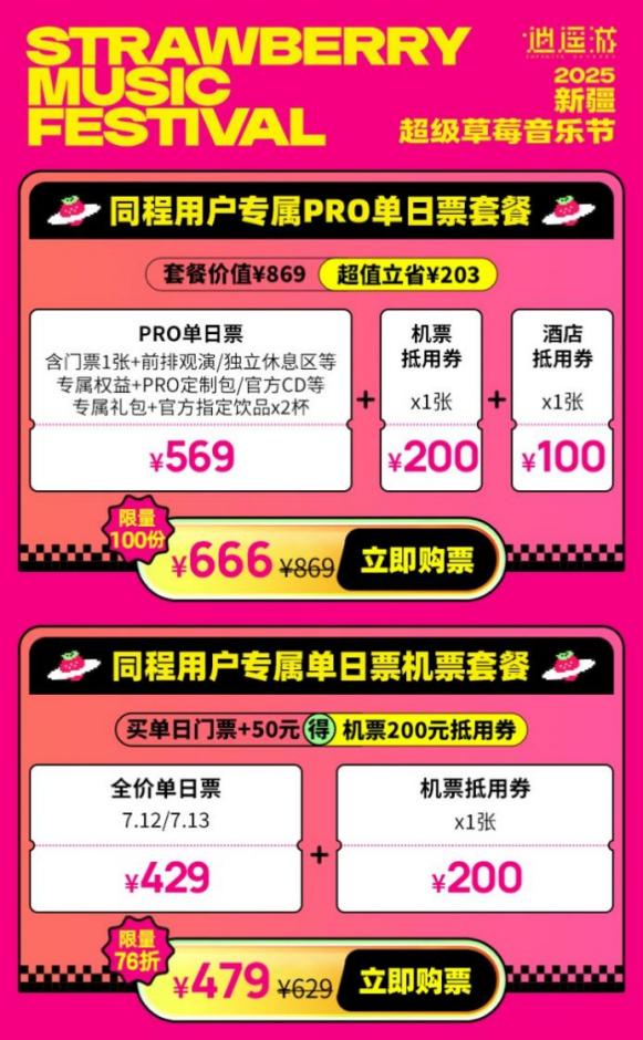 今年年初,草莓音乐节与同程旅行达成战略合作,推出“观演+旅行”一站式解决方案。随着暑期新疆游的火爆,6月23日 ,同程旅行宣布与草莓音乐节战略合作进一步深化,双方以乌鲁木齐为起点,通过整合演出票务、交通出行、目的地资源、酒店住宿,以场景创新与生态协同为文旅产业注入活力,共同探索“文旅+音乐”跨界融合新路径。