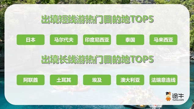 出境游方面,出境短线方向的日本、马尔代夫、印度尼西亚、泰国、马来西亚、新加坡等目的地,以及出境长线方向的阿联酋、土耳其、埃及、澳大利亚、法瑞意连线、英国-爱尔兰连线等均是途牛用户的热门选择。