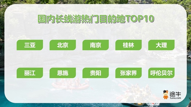 暑期中后程国内长线游热门目的地中,三亚、北京、南京、桂林、大理、丽江、恩施、贵阳、张家界、呼伦贝尔等预订热度排名靠前。此外,安顺、长沙、苏州、杭州、延边、白山、西宁、青岛等目的地的出游热度增长显著。