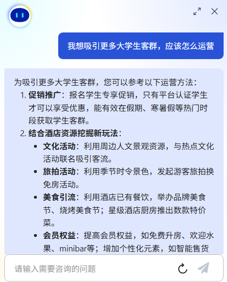 更关键的是,AI商家助手能够高效解答酒店商家日常运营中的关键问题。例如,它能实时分析酒店在同商圈内的竞争力状况,提供精准定位并吸引更多目标客群的策略建议,以及指导如何有效提升线上曝光度和流量获取,助力酒店优化经营策略。