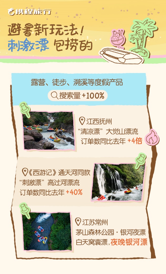 除传统避暑游之外,户外挑战和自然探索,如露营、徒步、溯溪等度假产品今夏也受到游客热烈追捧,搜索量同比增长超过100%。其中,衍生出各种新玩法的漂流成为今年暑期大势,位于江西抚州的“清凉漂”大觉山漂流,体感温度仅18-26度,同比去年订单数增长超4倍;有《西游记》通天河同款之称的高过河漂流则全长5公里,落差200米的“刺激漂”揽获年轻人喜爱,成交订单数同比增加40%;“白天窝囊漂,夜晚银河漂”,江苏常州茅山森林公园的银河夜漂也以出片的夜间美景成功出圈。