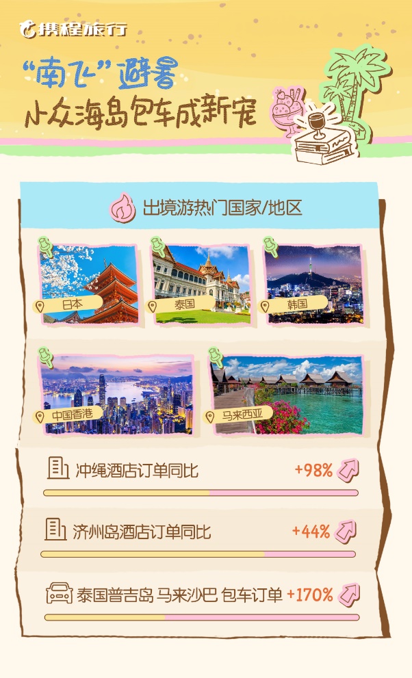 和国内避暑游大热趋同,出境游表现亮眼的目的地同样具有清凉属性,日本、泰国、韩国、中国香港、马来西亚位列前五出境游热门目的地。其中,短线海岛游增长强劲,日本冲绳酒店订单同比去年增长98%,韩国济州岛酒店订单同比增长44%。包车去海岛度假也成为了暑期不少游客的共同选择,泰国普吉岛、马来沙巴等地订单量同比增长170%以上。此外,海外长线包车游心智持续攀升,澳大利亚、意大利、德国等地订单增势明显。