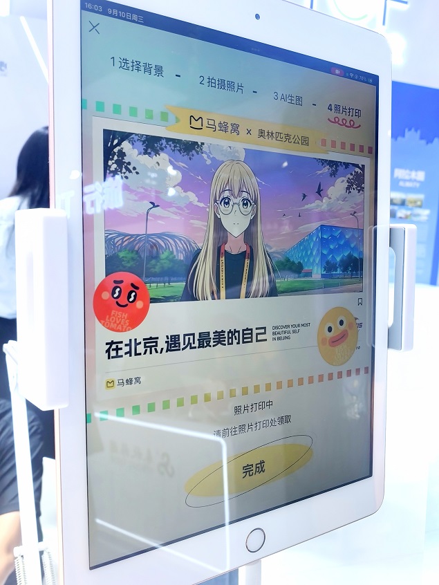 功能运用了最新的AIGC技术的“AI场景旅拍”是马蜂窝展台最具人气的体验项目。观众可在数字背景中选择长城、颐和园、故宫、鸟巢等北京知名景点,拍照后由AI实时生成卡通风格旅行照片,并可现场印制带有服贸会标识的纪念卡片,直观展现AI技术在文旅体验中的创新应用。