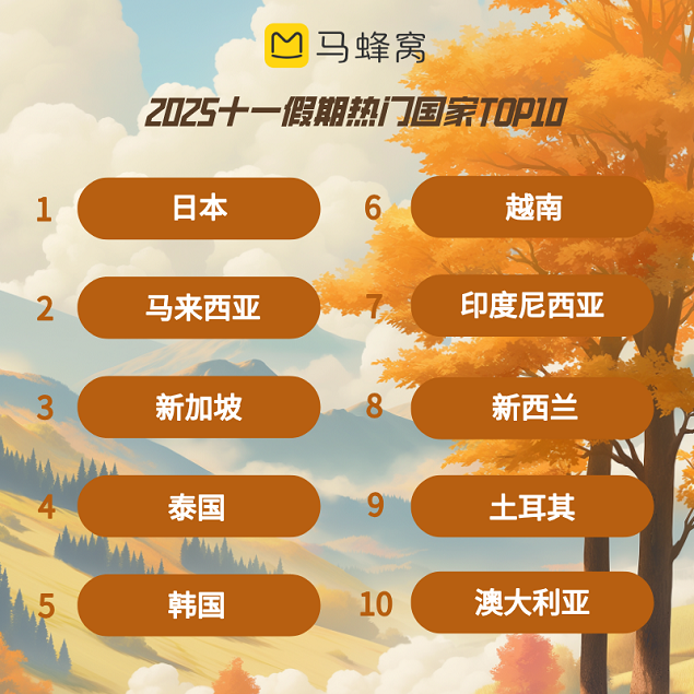 十一长假临近,马蜂窝大数据显示,随着北方各地渐次入秋,秋游开始被游客提上日程,“十一赏秋”近一周搜索热度环比上涨125%。节假日各地人潮汹涌,令寻找小众目的地成为越来越多人的诉求,“十一去哪人少”相关热度环比大涨200%。值得关注的是,AI工具正逐步成为旅行者行程规划的重要帮手,除整体攻略外,“十一避峰策略”和“行程备选方案”是近期使用马蜂窝“AI行程规划”用户着重关注的方向。