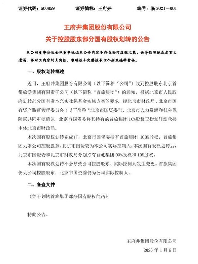 王府井集团公布,近日,公司收到控股股东首旅集团的通知,根据北京市人民政府划转部分国有资本充实社保基金实施方案的要求,经北京市财政局、北京市国资委、北京市人力资源和社会保障局共同审核确认,北京市国资委将其持有的首旅集团10%股权无偿划转给承接主体北京市财政局。