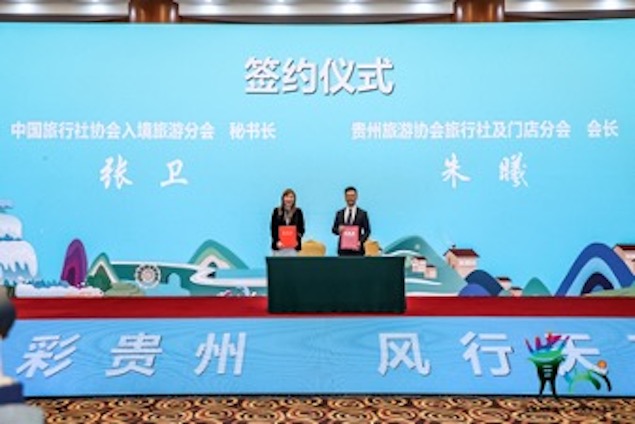 中国旅行社协会入境旅游分会与贵州旅游协会旅行社及门店分会签署合作协议。全国重点入境旅行社代表与贵州省旅行社代表、贵州重点景区代表还进行了关于“贵州机遇”的研讨会和交流座谈,共商如何促进贵州旅游的开放发展,提升贵州旅游的国际化水平。