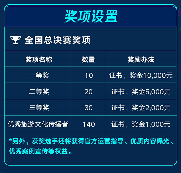 微信团队表示,大赛奖项将包含总决赛奖项以及大赛组织奖两类,其中全国总决赛奖项总奖金池为40万元人民币,分别设一等奖、二等奖、三等奖和优秀旅游文化传播者奖项,共计200人次;同时设置大赛组织奖,获奖组织将获得大赛证书和奖金1万元,嘉奖各大组织对本次比赛的杰出贡献,助力赛后持续推广旅游文化。