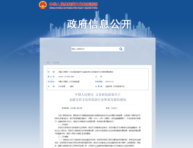 中国人民银行 文化和旅游部关于 金融支持文化和旅游行业恢复发展的通知