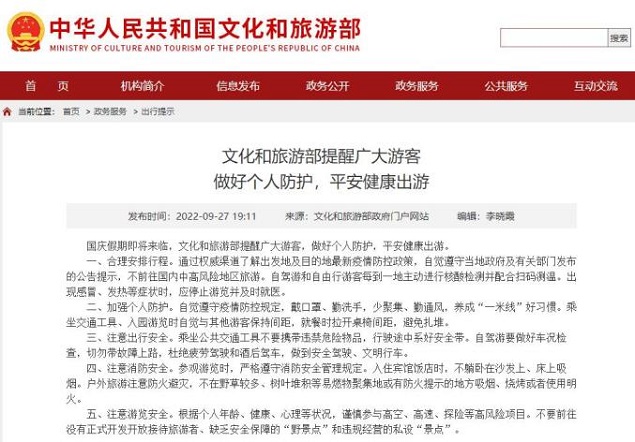 国庆假期即将来临,文化和旅游部提醒广大游客,做好个人防护,平安健康出游。