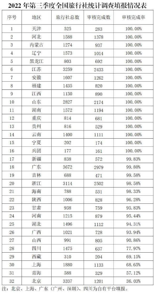 截至2022年9月30日,第三季度全国旅行社总数为44359家,第三季度全国旅行社统计调查数提官核完成率为89.91%。全国 27个地区数据官核完成率高于全国水平。其中,天津、河北、内蒙古、辽宁、黑龙江、江苏、安徽、福建、江西、山东、湖南、重庆、贵州、云南、宇夏、兵团的官核完成率达到 100%。(详见附件1)