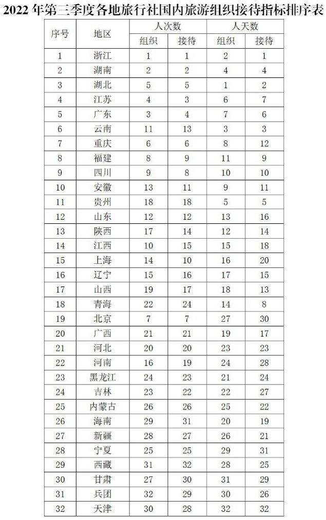 2022年第三季度旅行社国内旅游组织接待人次(人天)汇总排序前十位的地区由高到低依次为浙江、湖南、湖北、江苏、广东、云南、重庆、福建、四川、安徽。(详见附件3)