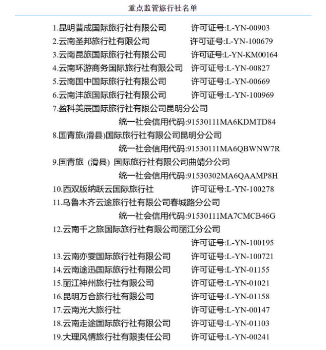 云南省文化和旅游厅7日发布通知,决定将全省2023年1月投诉量排名靠前的19家旅行社列入全省重点监管名单。请属地文化和旅游部门对重点监管名单所列旅行社进行约谈整改,列入州市红黑榜的“黑榜”。