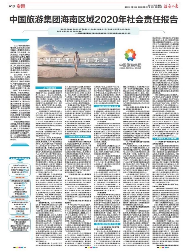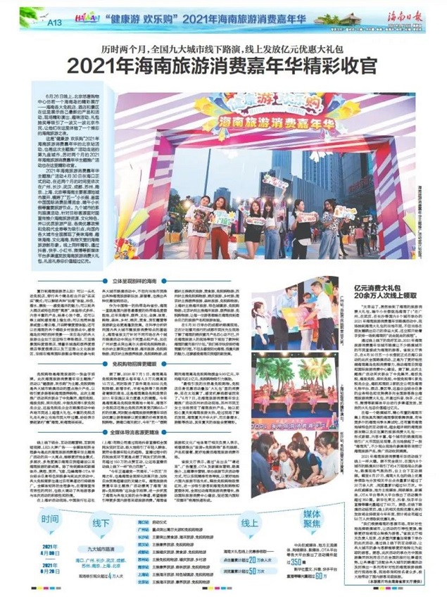 由海南省旅游和文化广电体育厅主办,中国旅游集团海南区域总部协办,中旅旅行(海南)有限公司承办的2021年海南旅游消费嘉年华总结报道已在6月29日的《海南日报》专题整版上刊登。据省旅文厅统计数据发布,参与本次活动现场观众量累计约4万多人次,线上大礼包的优惠券领取与分发相关平台点击量累计超过了20万人次,浏览量累计超过50万次,活动期间已核销免税代金券超2万套,间接带来收益超亿元。新华社图文、抖音、快手平台直播板块曝光量约60万多次,图片直播目前点击量为56万以上。7月5日,《中国旅游集团海南区域2020年社会责任报告》在《海南日报》专题整版刊登,展现央企担当,树立央企榜样!