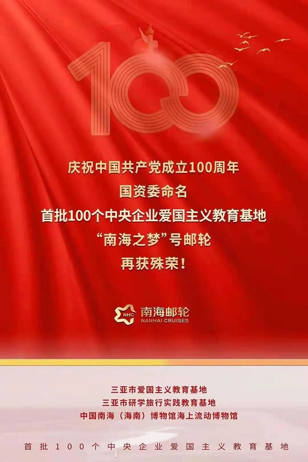 在庆祝中国共产党成立100周年之际,为了突出展示中央企业红色基因、红色血脉,深挖红色资源的思想内涵和时代价值,突出展现在中国共产党领导下中央企业百年发展中涌现的先进精神、先进典型和铸就的大国重器,2021年6月29日,国资委公布首批100个中央企业爱国主义教育基地,中国旅游集团旗下“南海之梦”邮轮(中国(海南)南海博物馆海上流动博物馆)成功入选。