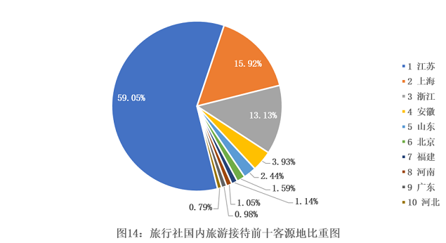 受疫情影响,国内旅游主要是省内游和周边游。从接待人数看,省内游客占比约60%,江浙沪地区占比高达88%。国内旅游客源地前十依次为:江苏省、上海市、浙江省、安徽省、山东省、北京市、福建省、河南省、河北省、广东省。在长三角文旅一体化助推下,三省一市互送客源趋势明显。
