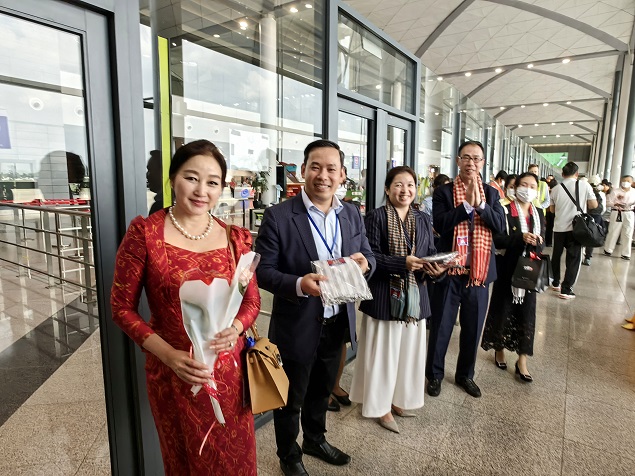 柬埔寨旅游部国务秘书和萨伦阁下及深圳航空金边站相关领导专程前往机场出席接机仪式,不仅以柬埔寨国家接待客人的最高礼仪“挂水布”来迎接首批到来的中国游客,还送上精美的纪念礼品,这足以体现柬埔寨当地对中国游客的重视。